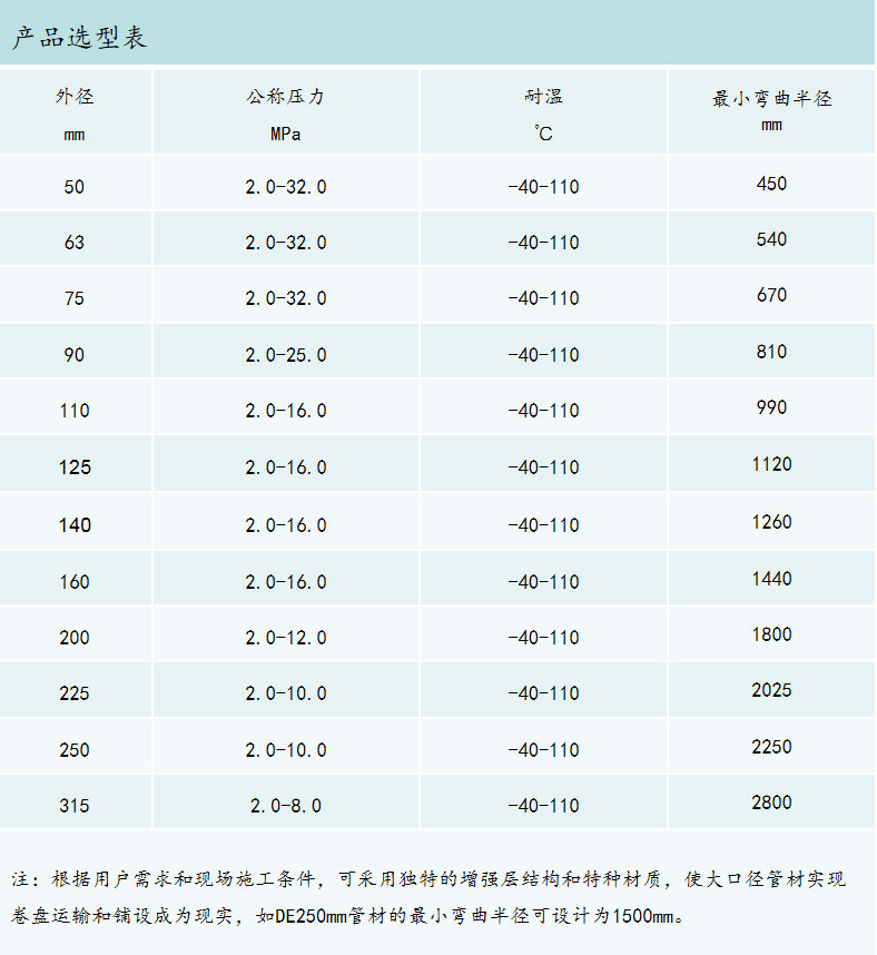 1、內(nèi)芯管:混煉擠出成型,根據(jù)不同礦化度/不同化學(xué)成分/不同輸送溫度的流體介質(zhì),科學(xué)設(shè)計(jì)材料配伍,可采用PE/PE-T/PEX/PP-R/PB/PVDF/UHMWPE等